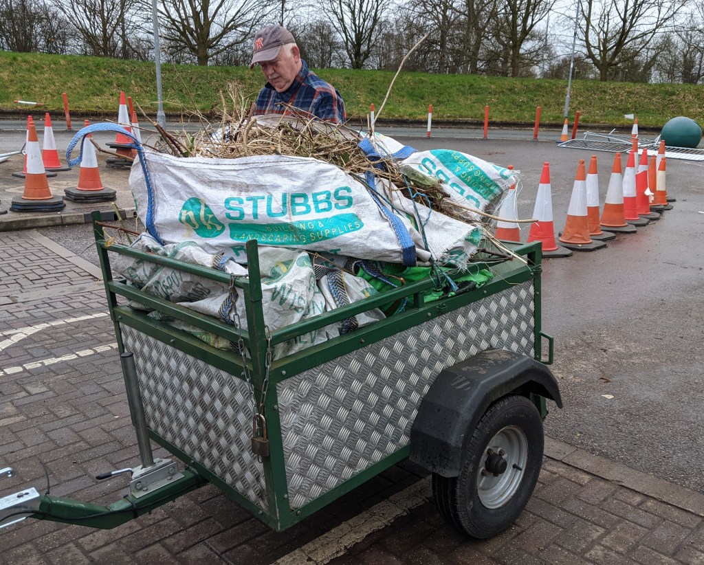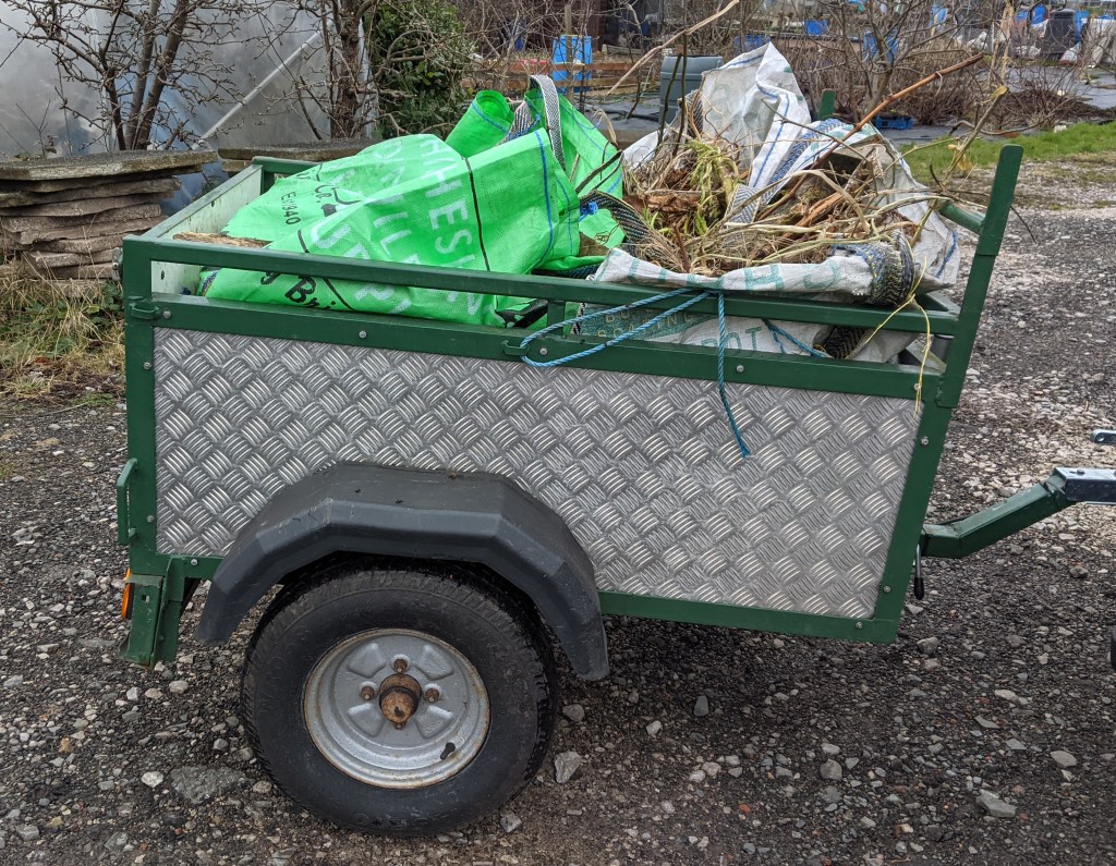 Cliff caught me and asked for some help taking some cuttings to the tip. Between us, we lugged two enormous builder’s bags onto Cliff’s trailer. The second one weighed a ton. The only way to get it onto the trailer was for me to stand on the trailer and pull whilst Cliff heaved the bag up the ramp. By the time it was securely on the trailer, I had managed to sandwich myself between the bags and had to employ rusty gymnastic skills to extracate myself from the trailer. Cliff then drove around to the car park and I ran through the site to let him in. Next to the car park were another two bags – one went into the boot and the other got tied on to the top of the trailer.