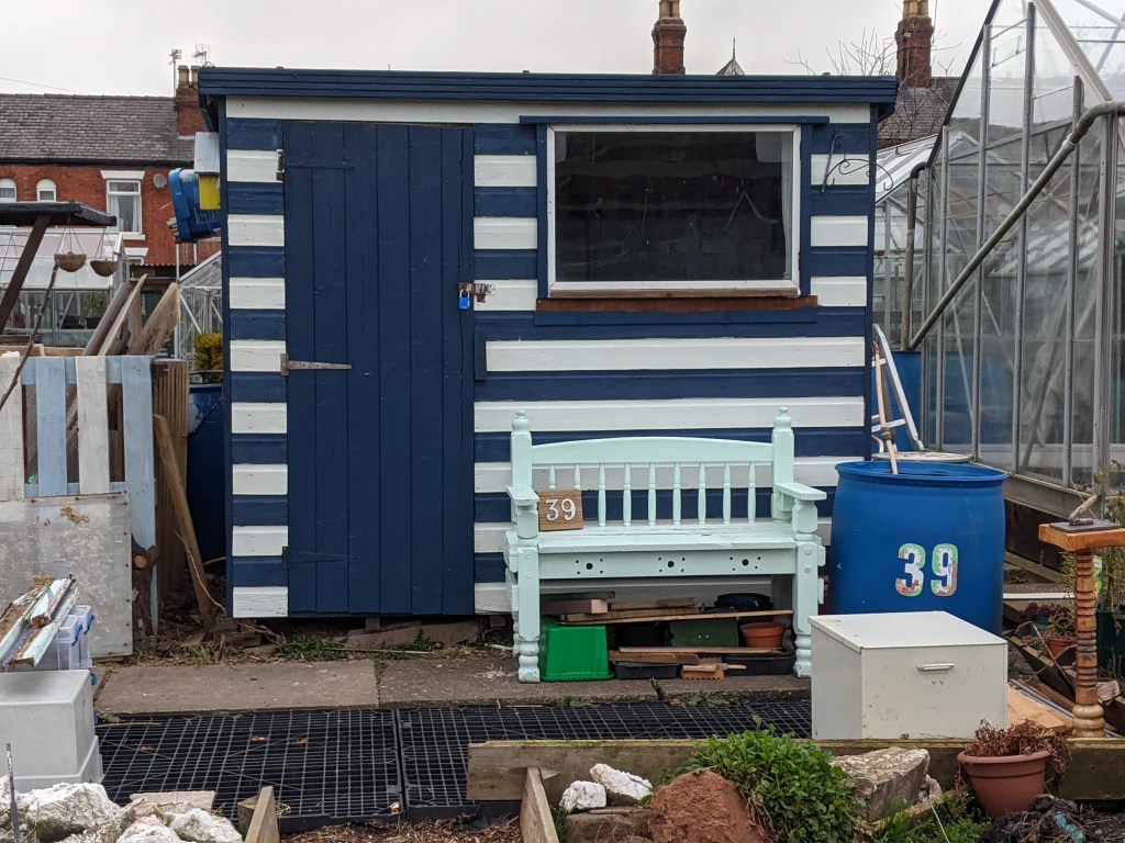 Once the sanding was done, I looked for my paintbrush. I have two good quality ones…somewhere. But where had they gone? I searched and searched with no luck. Eventually, I walked down to Sarah and asked to borrow one of theirs before she left. Trudging back to the shed, I decided to have one final look. Murphy’s Law states that whatever you are looking for, you will find once you have borrowed it from someone else. Irritatingly, Murphy’s Law was correct and I discovered I had hung up the brushes neatly on the side of the shed. Muttering various admonishing phrases to myself about not looking properly, I made a start. The weather was closing in and I was worried about rain. Luckily, I managed to get two coats of navy paint onto the frame and the bottom of the new front panel before the cold drove me home.