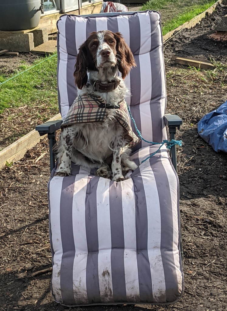 Plottering is a word that has been coined on site to mean spending hours dawdling at the allotment, starting different jobs but completing none of them, chatting with fellow plot holders and enjoying the slice of paradise the site offers. I plottered today. I began with a specific job in mind – painting the shed. I ended up spending a lovely half an hour with Cliff, Sarah and Koko eating ice cream and chatting about Liz’s need for a second shed. Koko sat resplendent on Sarah’s chair, Queen of All She Surveyed.