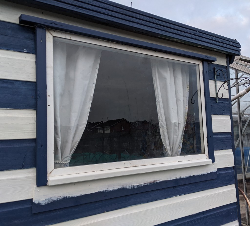 On the way back to painting, I fell to browsing online and discovered to my delight, a local person selling a home made potting bench. I immediately bought it and arranged to pick it up later. Flushed with success, I went back to painting around the new window. I had forgotten the masking tape at home, so I cast about for something else to paint. The back of the shed facing the patio hadn’t had a fresh coat of paint this year. So I set about painting it. Last year’s cream colour was easily covered and I think it will add much more light into what can be a dark part of the plot.