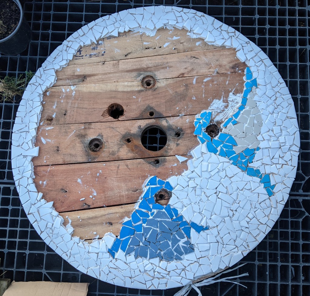 An hour later and I was cold and almost unable to move. I gave up. But I had worked out the design I wanted on the table top and had begun to make a start on it. I thought it looked pretty good considering! Clearly, I will need to go over it when the mosaic is finished to fill in the gaps with grout (another long job!) but for now, it would do!