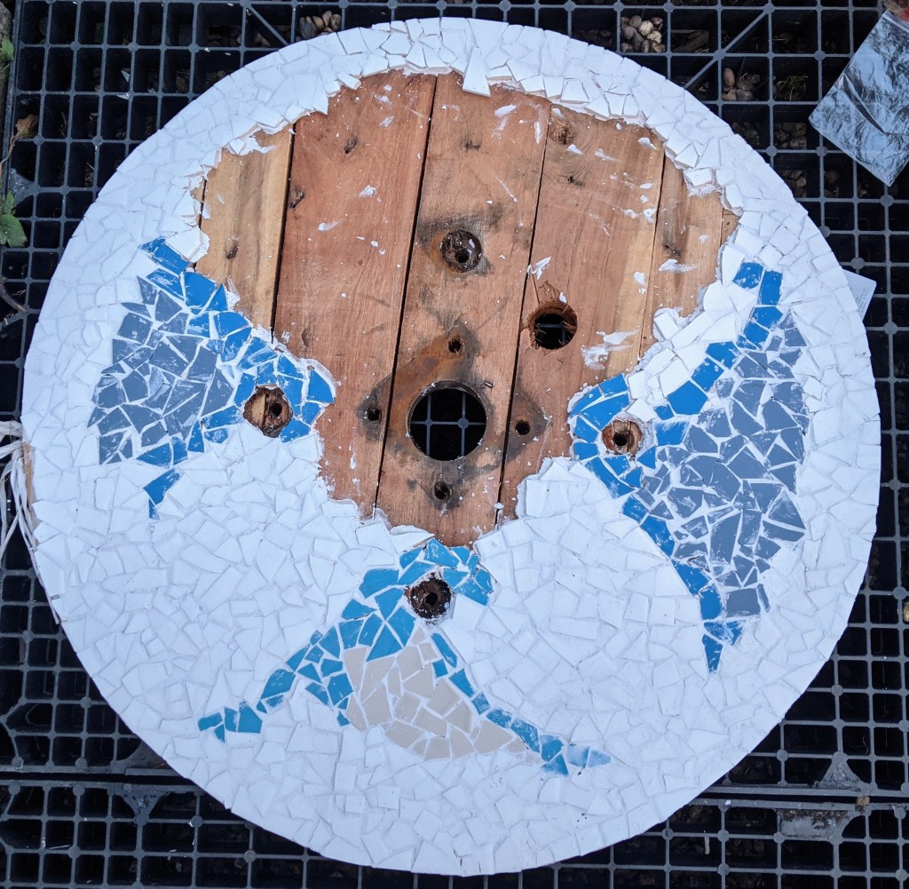 Several weeks later, the shed upgraded and tidied, each time I opened up the shed, the unfinished table greeted me. So one dry afternoon at the end of March, I opened the second adhesive bucket and carried on. It was freezing cold. However, ending up as a human icicle after several hours wasn’t a concern now that we had our new stove. Each time I sat up and stretched, I added another couple of logs to the stove. As the hours melted away, I created the third wave and filled the gap between the previous one. As the grout was not entirely dry on the rest of the table top, I spent the last hour, filling in the gaps between the tile pieces. I used a damp cloth to wipe off any excess grout. Although I will need to scrape off the rest another day. Maybe I’ll wait until I finally finish the mosaic… If that ever happens!