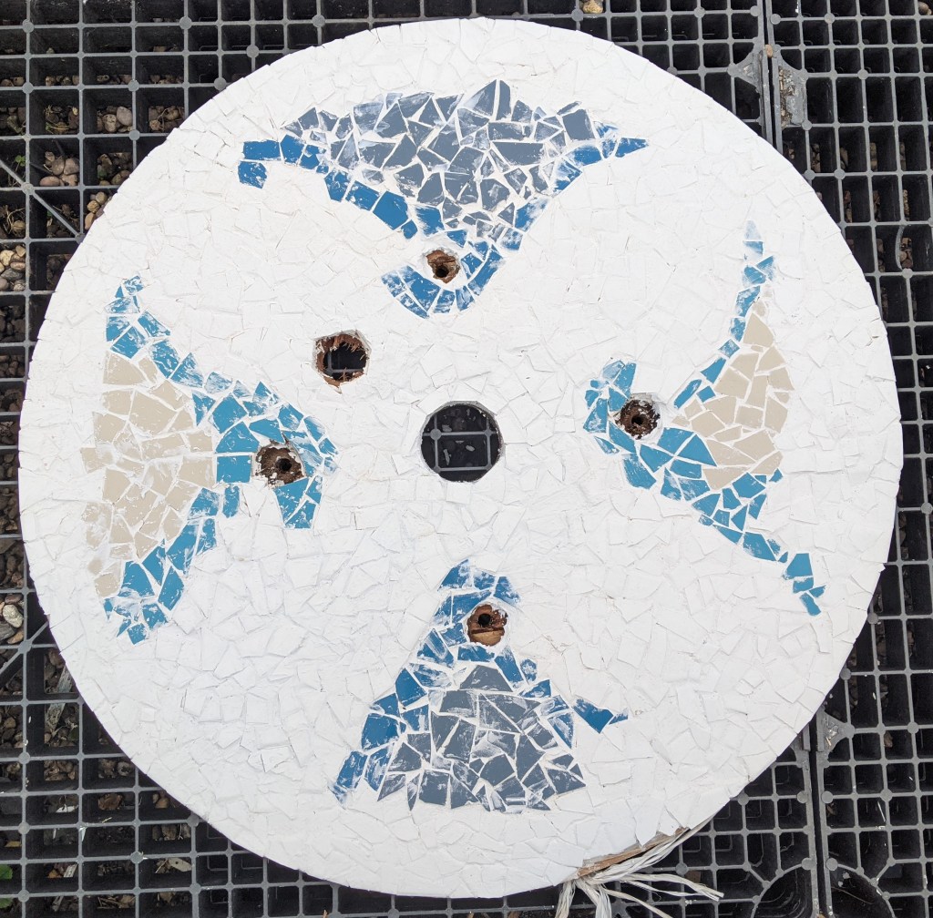 I ended up wandering the tile aisles in B&Q, picking up a selection of sample tiles in a range of shades of blue and green. Lugging them home was interesting. My backpack weighed a ton and I had to stop on the way to pick up the tile adhesive too. Resembling an African land snail, I dragged myself home to wait for another delivery. After my husband finished work, we collected the two boxes full of broken tiles before picking up a wire brush and hammerite for the metal rods that hold the reel together. This was rapidly turning into rather a big project. Much bigger than I had originally planned. Oops!