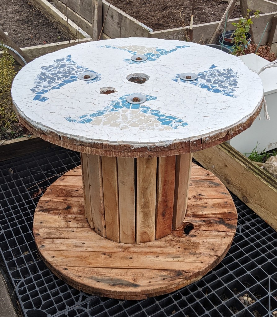 The table top needs some cleaning and tidying of the grout and the rest of the wood needs treating – I am thinking of teak oil to give it a nice colour. But after over two months of on/off work, the table is complete!