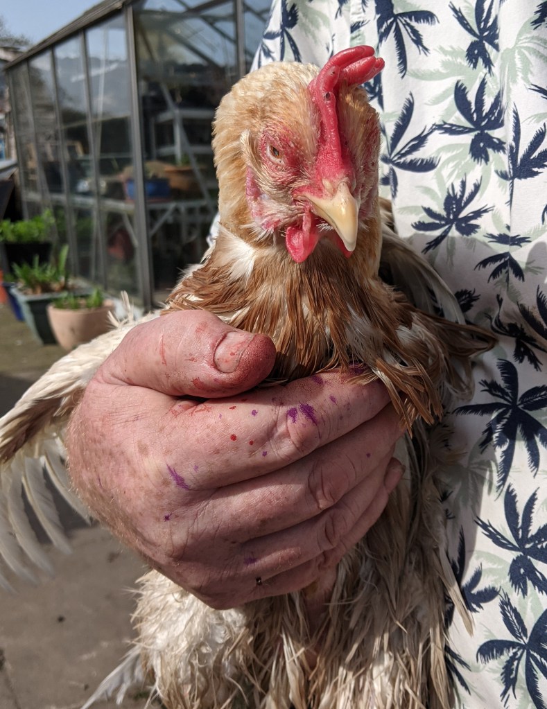 We checked the other chickens to see if they were showing signs of bumblefoot. They weren’t but I spotted another issue with the white leghorn. She seemed to have a prolapse. We decided it would be best to put her on her own as chickens have a tendency to peck at each other, especially if they are injured. I grabbed some bedding from my plot and put it in Cliff’s broody coop. By the time the food, water and bedding was sorted, Cliff picked her up and checked her once more. The prolapse seemed to have resolved itself. Typical. But to give her time to recover from surgery, we put her in the coop so she could have some peace and quiet.