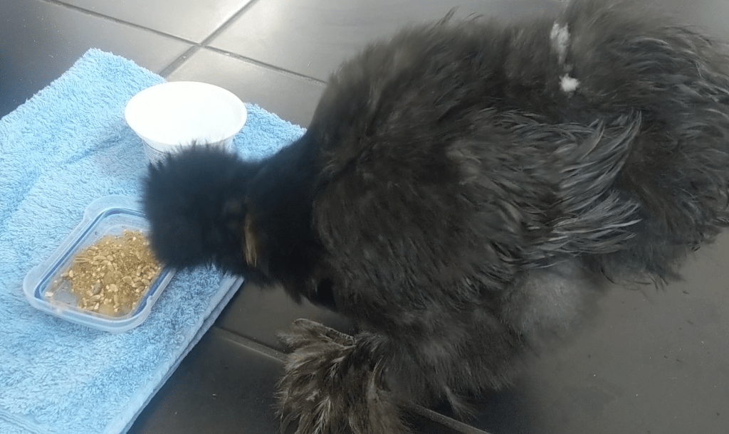 Worried, I picked her up and brought her into the kitchen whilst frantically messaging a lovely lady who runs a special needs chicken group online. Despite the time difference, she replied immediately, telling us to mix dried oregano with apple sauce. Odd as it sounded, I dropped everything and ran to the corner shop. Searching the shelves, I spied three small jars of apple sauce. Grabbing two, I paid and dashed back home. I spooned a bit of the apple sauce onto a plastic lid, mixed in the oregano and gave it to her. Typically, she turned her beak up at it. I tried hand feeding her but she was having none of it. After several minutes of wrestling to get two tiny bits down her, I gave up. Chickens are quite prone to stress and I didn’t want to do anything to make her worse. Messaging the lady again, she recommended adding a few bits of corn to the apple sauce mix.