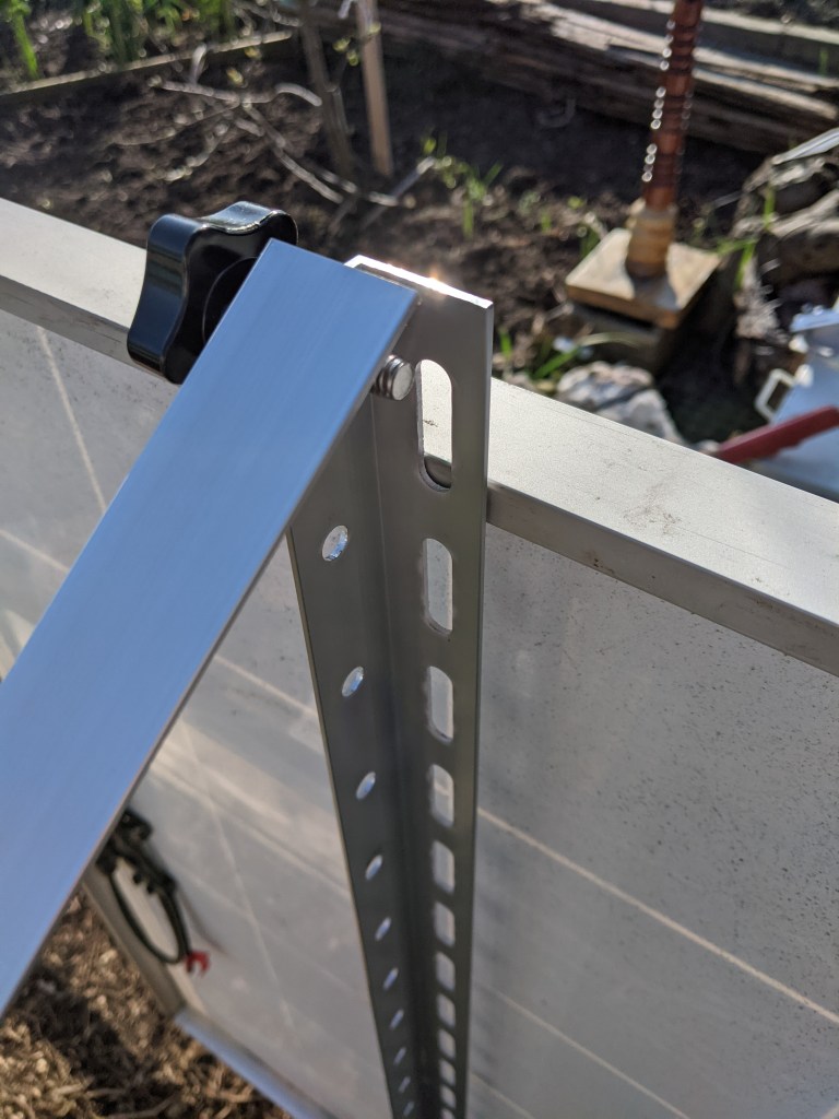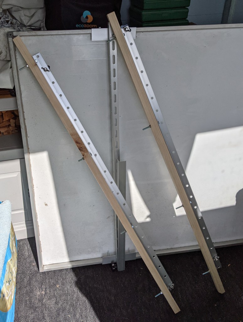 Easter Monday dawned bright but with a cold wind. Not ideal for putting up the solar panel but no matter. Today was the day! Arriving in B&Q we found the angle bracket section. No uneven brackets and even worse, no brackets that were short enough. Beginning to despair that this project would ever be possible, I noticed a section with aluminium angle profiles. Those might do the trick! More disappointment followed when the one size I needed was sold out. Cursing under my breath, I got out my phone and began to search any shops that might have anything useful in stock. Wickes had an angle profile and in the right size and, more importantly, in stock! I immediately ordered one for click and collect, rounded up my husband and we dashed home to get the car. Once I had the profile, I ran to the allotment, working out how long each bracket would need to be.
