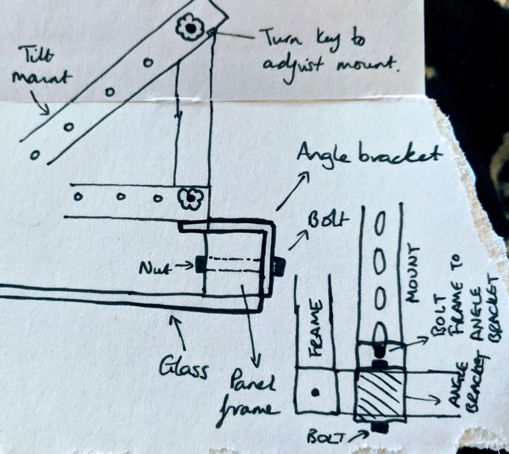 The final part of attaching the tilt mount required drilling a hole in the top of the bracket and bolting them together. Using two thick pieces of wood on the back of the panel, I cautiously drilled the holes. The wood provided protection for the glass if the drill slipped. Slowly, I lined up the mount in the middle of the bracket and began to attach the bolts. To my surprise it worked well although the bolts need proper tightening tomorrow with a couple of spanners.