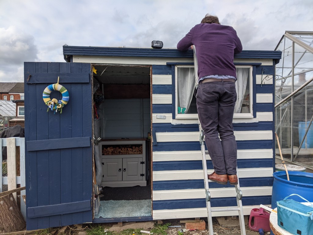 Before we could do anything else, I needed to make sure the small leaks in the shed roof were fixed. There are a few points where water tends to drip slightly during heavy showers. Using a ladder, a claw hammer and a tube of sealant, I took out the nails one at a time, covered the hole with sealant and hammered it back into place. For good measure, I covered the head of the nail with sealant too. The next few days we had no rain whatsoever, so I await a heavy downpour to check if my repairs have worked!