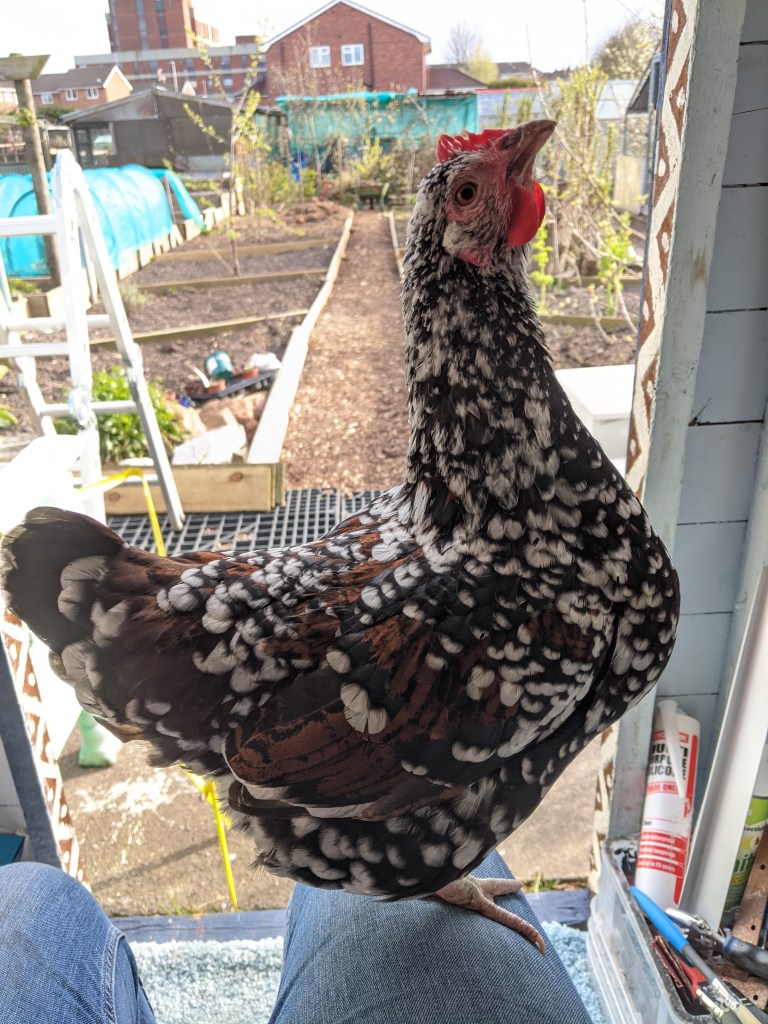 At half ten, I ran back home and we both jumped in the car. We drove to the services at J16 of the M6. There we met a lovely lady who was selling a silver birchen bantam hen. Apparently she is a breeder and shows her chickens so I was confident that her birds would be in excellent health. The only reason she wasn’t breeding from this particular hen is that she is a little large for the breed standard. Hatched in September, she is laying and is quite tame. As I climbed I to the car with the box containing our newest arrival, my husband pointed out the irony of buying a chicken outside a KFC. He had a point! Carefully, we drove back to the allotment, full of excitement to see what Roxy would make of her new little friend.