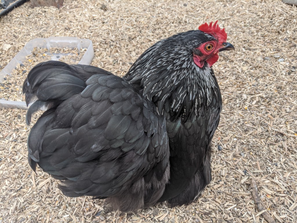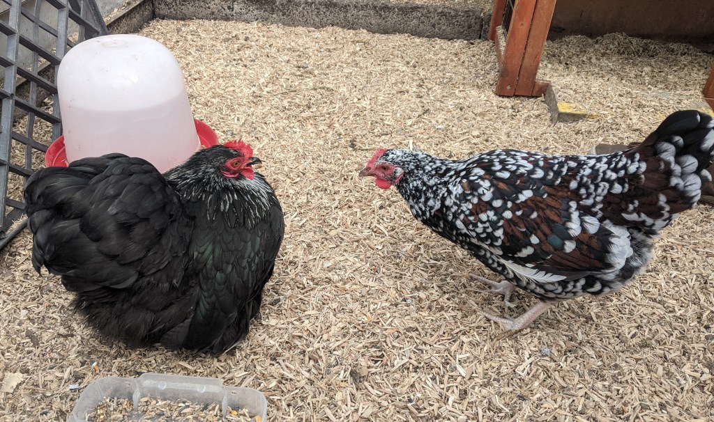 We took the new hen out of the cardboard box and had a good look at her. She is all black except for some lovely silver flecks around her neck. Between us we had spent the drive across trying to think of a name for her and my husband liked Trixie. I’m not sure whether it’s a trait of the breed, but Trixie has a rather big-eyed look to her. In the greenhouse, we put her down and let her explore. Roxy was so excited to see us, she completely ignored Trixie until we picked her up and put her next to Trixie. It was a tense moment. Would they fly at each other? Would Roxy terrorise Trixie like she had done to the silkies at home?