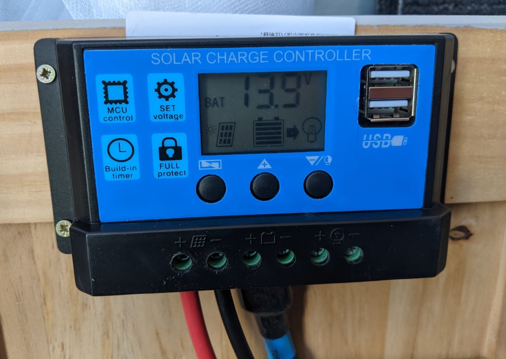 Late afternoon, I walked back to the allotment armed with a multimeter. Once and for all, I was going to find out why my solar system wasn’t working! Adjusting the ladder, I reached for the cables and connectors by the top of the panel. I disconnected the cables and used the multimeter to check the panel was working. As I waited for the voltage to appear, I held my breath. Up it came on the screen – it was working! What a relief! Now I knew that the problem was probably the MC4 connectors. Separating them, I noticed that the crimped ends seemed a long way back in the socket. Wondering if that might be the problem, I compared it to the other connectors on the cable running into the controller. Sure enough, the crimped ends were much nearer the top of the connector. I took off the MC4 casing on the live wire and removed a little more of the plastic covering the cable. Inserting the crimped end back in, I pushed hard and felt a click. Turning the connector around, I saw that the crimped end was much further forward than before. I had a sneaking suspicion that this must have been the problem. Quickly, I did the same to the second connector and reconnected everything. Then I climbed down the ladder to see if it had worked…
