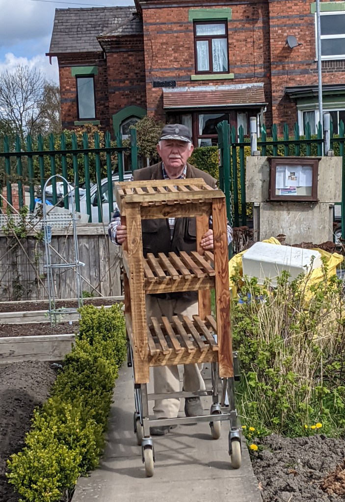 By the time I had opened up the shed, had a chat with Geoff, Andy and the others, the morning was half gone. I found Cliff and we set off to the guy who has been busy making the potting bench order. He only lives a few minutes from the site and with Cliff’s car and trailer, we were confident that the benches would be easy to get to the allotment. Upon arrival, we managed to get one into the back of Cliff’s car and the other upended in the trailer. When we arrived back, we deposited the benches on the front and jumped back into the car for the last bench and my wellie store. As we finished loading the car, Cliff spotted that the man made benches. He immediately put in an order for his front garden at home. All spent up, we drove back to site.