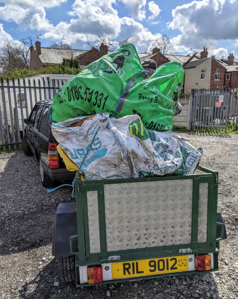Today was the day that nonessential shops could open for the first time since December. Up early, I dashed into town before it got too busy and popped into my favourite shop. Armed with new sewing fabric, I began to wall home. Partway back, I spotted I had a missed call from Steve. I called back to let him know I was on my way down. As I arrived on site, I spotted Steve with Dave the Plod and Cliff. I said hello and Steve explained his deal – the old greenhouse Fiona and I had dismantled and brought into site (and never managed to get up!) for the 2m x 3m chicken coop on his plot. I immediately agreed and Will got busy loading it onto Steve’s trailer to go for scrap. Very excited, I messaged my husband to let him know.