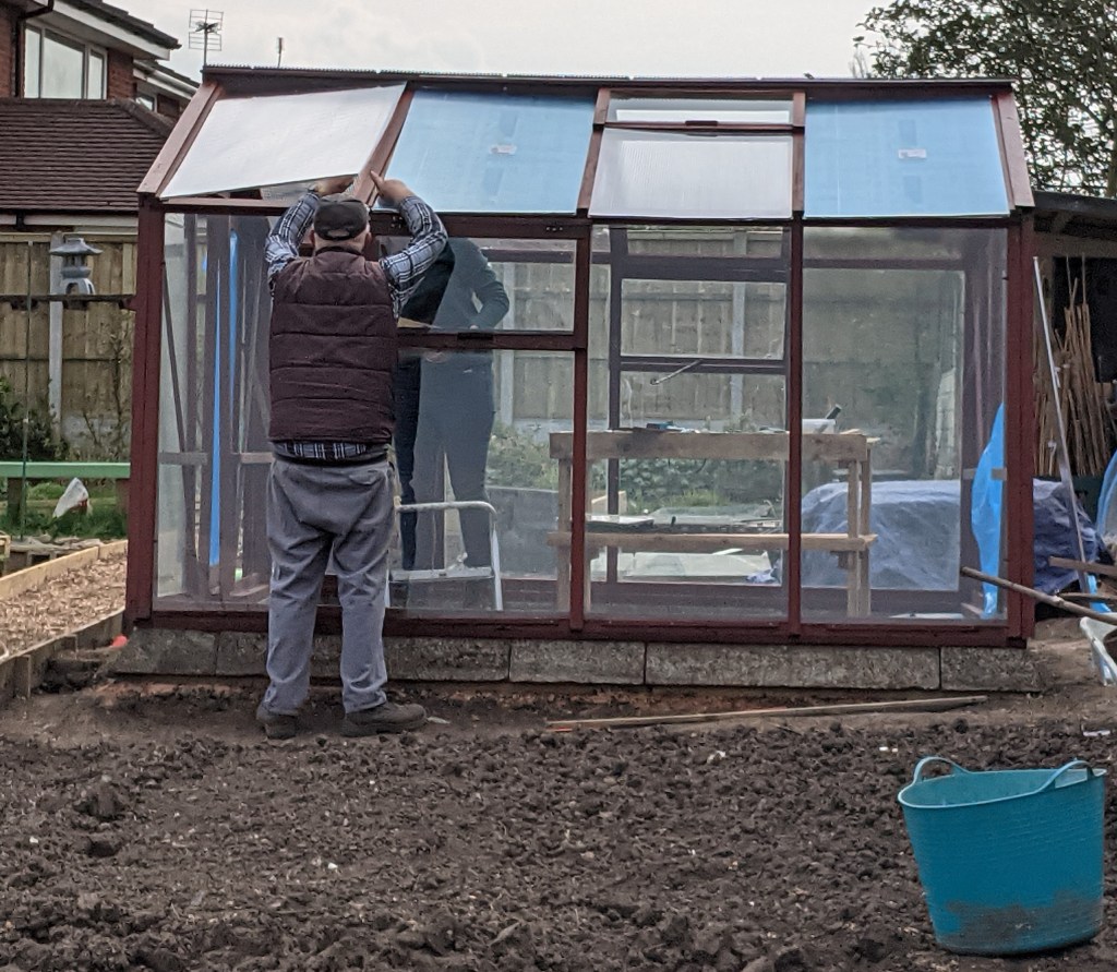 Today I ran down to the allotment ready to work on getting the new chicken run into place. When I arrived, I said hello to Sarah and Cliff who were busy working away on the new greenhouse. By the time I got there, they had managed to get in one of the front panels and were moving into the roof.