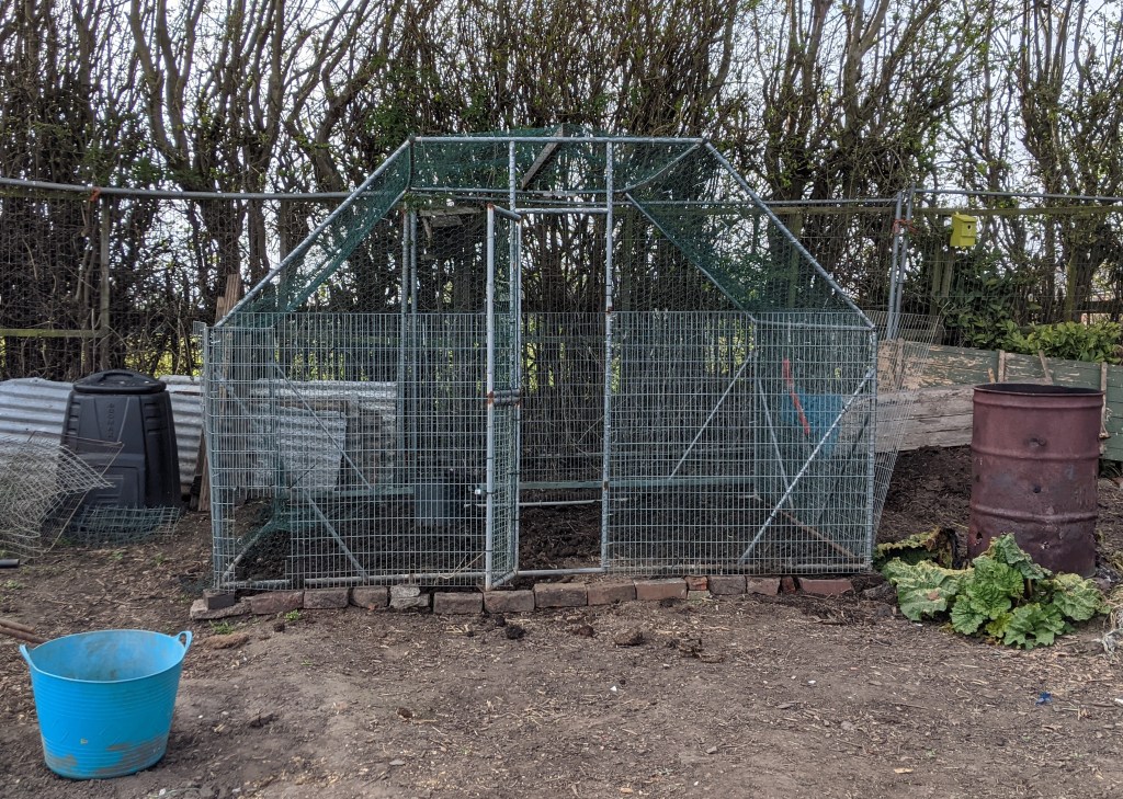 Slowly, I edged the run around into position, carefully avoiding the rhubarb, raised beds and compost bin. Next, I began to try to level out the soil. There is a definite slant to Liz and Sarah’s plot! Carefully, I started to dig out along the back section of the run, in the hope it would drop down to make the top of the run level. It worked partially. By the time I had decided I would need to prop up the front of the run, I was sweltering from a combination of sunshine and the heat radiating from the burner. Making an executive decision, I downed my spade and trudged to the corner shop in search of ice cream.