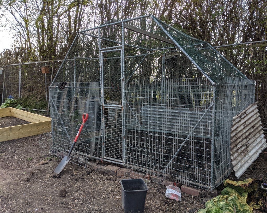 Finally, I collected the wire that Rachel had kindly given us and tried to work out where it would all go. A vital part of a run isn’t just the wire fencing over the run but the wire that is dug into the ground which can deter foxes and other predatory animals from getting at your chickens. There was almost enough to go around the run but not quite. Pondering Phil’s coop, I remembered Liz and Sarah had some old pieces of corrugated iron which might solve the problem. I pulled the iron out and had a look at it. Three pieces seemed in quite good shape so I laid them around the back and one side of the run.