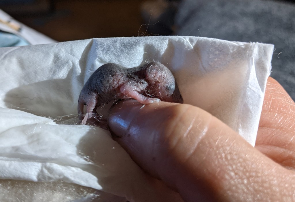 Dreading what I would discover, I slowly opened up the cardboard box. There was the little mouse. It was very still. Gently I lifted it out and it moved a leg. Urgently, I grabbed the syringe and spent ten minutes regularly dropping milk around it’s mouth. Quite quickly, it started to wriggle and move about. Throughout the evening, I kept feeding it – at one point, much to my husband’s exasperation, I was sitting on the sofa with the mouse in my hands. Usually, small mice would cuddle up to their siblings in the nest. Without siblings, our little mouse was at risk of cold. So finding something bald and warm, it curled up next to it.
