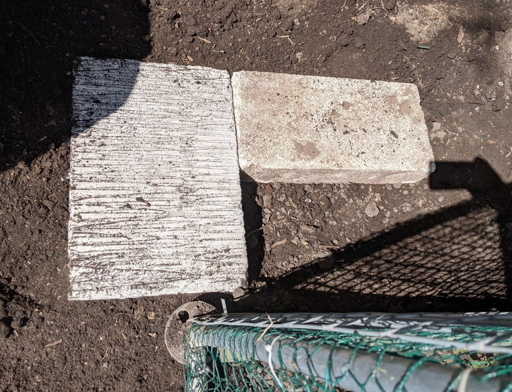This morning the weather was so lovely, I got down to the allotment early. I had found a couple of people who were selling breeze blocks and whilst I waited to see whether I could collect them later, I got busy with the blocks we already had. After a brief chat with Cliff and consulting a technical diagram he had drawn, I started on the corners of the base. The theory goes that this will stabilise the frame and allow the blocks to be put along the sides and back once the ground was level. Then the large slabs Phil helped remove from the greenhouse would be used to stabilise the front of the frame, simultaneously providing a path and a fox proof front to the run.
