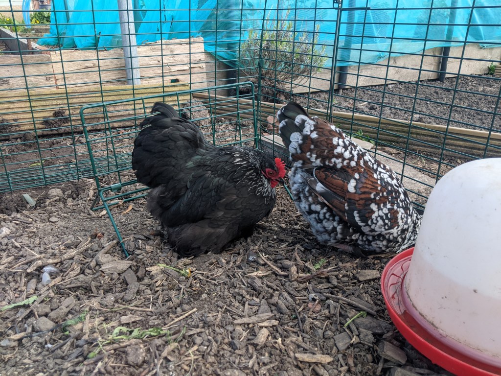 I ambled down to the allotment this evening to see how Snap and Sadie were getting on with the others. When I arrived Lilja and Leia were confidently walking around the run with Sadie and Snap hiding behind the perches. Rolling my eyes, I watched as Lilja and Leia took themselves to bed. Leia however, didn’t want to share the nest box and refused to let Snap in. I shoved Leia out of the way and Sadie hopped in. Poor Snap stood on the ramp dithering. Clearly she wanted to go inside but didn’t want to be pecked by Leia. I gently caught her and put her through the door and shut the door. There were a few clucks and some shuffling but no angry shouts.