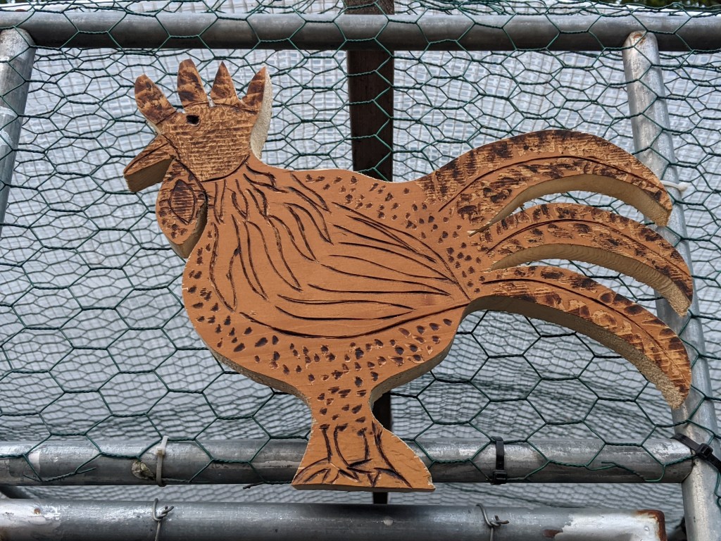 Before I left, I walked around once more to check each coop and it was then I spotted a new addition to the coop on Liz and Sarah’s plot – a gorgeous wooden chicken above the run door. I immediately recognised it as Will’s beautiful wood work. It’s a beautiful decoration for the run!