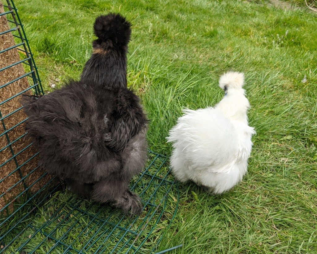 The hilarious part of letting the silkies out is the reaction of my two cats. I am always on guard incase one of them shows any stalking behaviours. However, at the grand age of seven, they have yet to catch anything larger than the occasional fly or moth. Thira, our timid longhair, is so terrified by these other fluffy clucking things that she almost always refuses to go outside if the silkies are exploring. Vasili on the other hand, our accident prone shorthair, has moments where is curiosity gets the better of his fear. In these rare moments, he will sniff cautiously at the silkie (often it is Cirrus) and the bird turns to look at him. The instant the bird moves towards him, he flees in terror. Yes, even from Cirrus who is half the size of a normal USA silkie. Terrified as Vasili is of the girls when free-ranging, this doesn’t stop him enjoying studying them on his favourite perch – on top of the run.