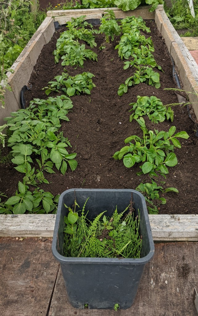 As I looked out at the plot, I realised quite how badly the weeds were coming through. One week of limited visits and they were growing like wildfire. By now, most people had left for lunch and I pottered across to Geoff’s plot to see how the potatoes and onions I had planted were getting on. Much to my surprise, the potatoes already needed banking up and almost all the onions had taken! In between all of these however was the nightmare that is mare’s tail. This prehistoric weed is an absolute beast to remove. The roots go down unbelievably deep and even the smallest bit of broken green leaf left in the soil will immediately grow. Fortunately, I have a solution for mare’s tail. Not some magical way of making it never reappear, but an easy way to get rid of it. Chickens. Our chickens adore it and I confess to feeding our chicks almost nothing else when we start to introduce greens. Leia in particular can’t get enough of the stuff. The first bucket of weeds went into the green Omlet, the second to the new coop and the following two into the main coop. Each bucketful was greeted with massive enthusiasm.