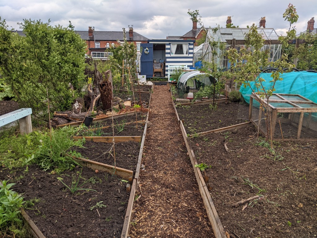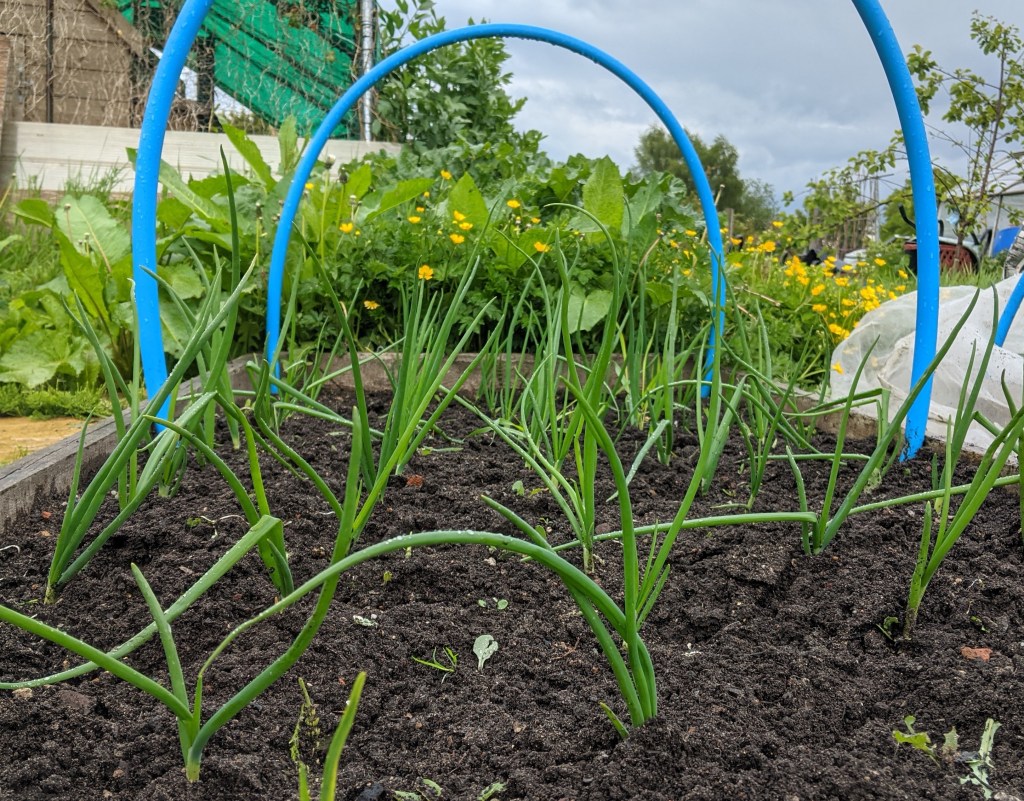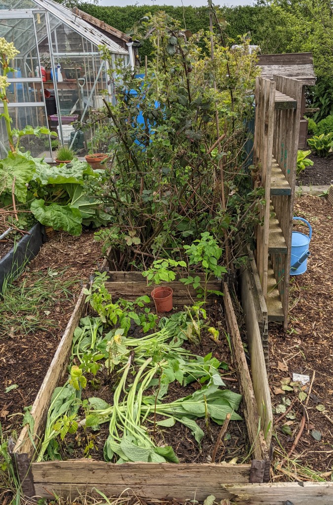 As I was weeding the beds, the clouds had started to come over and by the time I was finished, it was raining. Usually at this point, I retreat to the shed or go home. Today however, this seemed churlish. I battled on, planting a few more small rows of Stuttgart onions to fill the gaps in the onion bed before clearing the last raised bed of another ton of weeds. Into this bed, I have planted three different varieties of French bean, a small row of Swiss chard, two small rows of snowball turnip (highly recommended by Tracy and Steve) and some sugar snap peas. The latter I have never grown before but it’ll be interesting to see if they work! I felt rather on a roll despite being somewhat soggy around the edges.