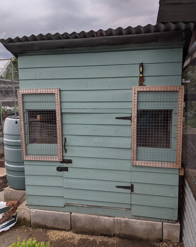 The skies were blue, the air crisp and there wasn’t a rain cloud in sight when I arrived on site this morning. Lots of people were down, making the most of the dry spell before the inevitable rain forecast for the entirety of the rest of the week. I said hello to Geoff and Andy who were chatting on the main path. I opened up the shed and came back when Andy called saying he was getting rid of his chicken nest box and run as Brad wanted to put in a large polytunnel. The nest box is situated outside the run and is a converted wooden Wendy house. It’s gorgeous and my only hesitation in accepting his very generous offer was its size. The main coop runs the entire width of our plot and the back joins the narrow winding path across the site towards the car park. The only place it might fit was directly in front of the coop however, I wasn’t sure if there would be enough room between the coop and the fruit tree bed. Borrowing Andy’s measuring tape, we measured up the nest box to find it was 3ft wide by 5ft long. Down we went to the main coop and measured out the dimensions. It couldn’t have been a more perfect fit!