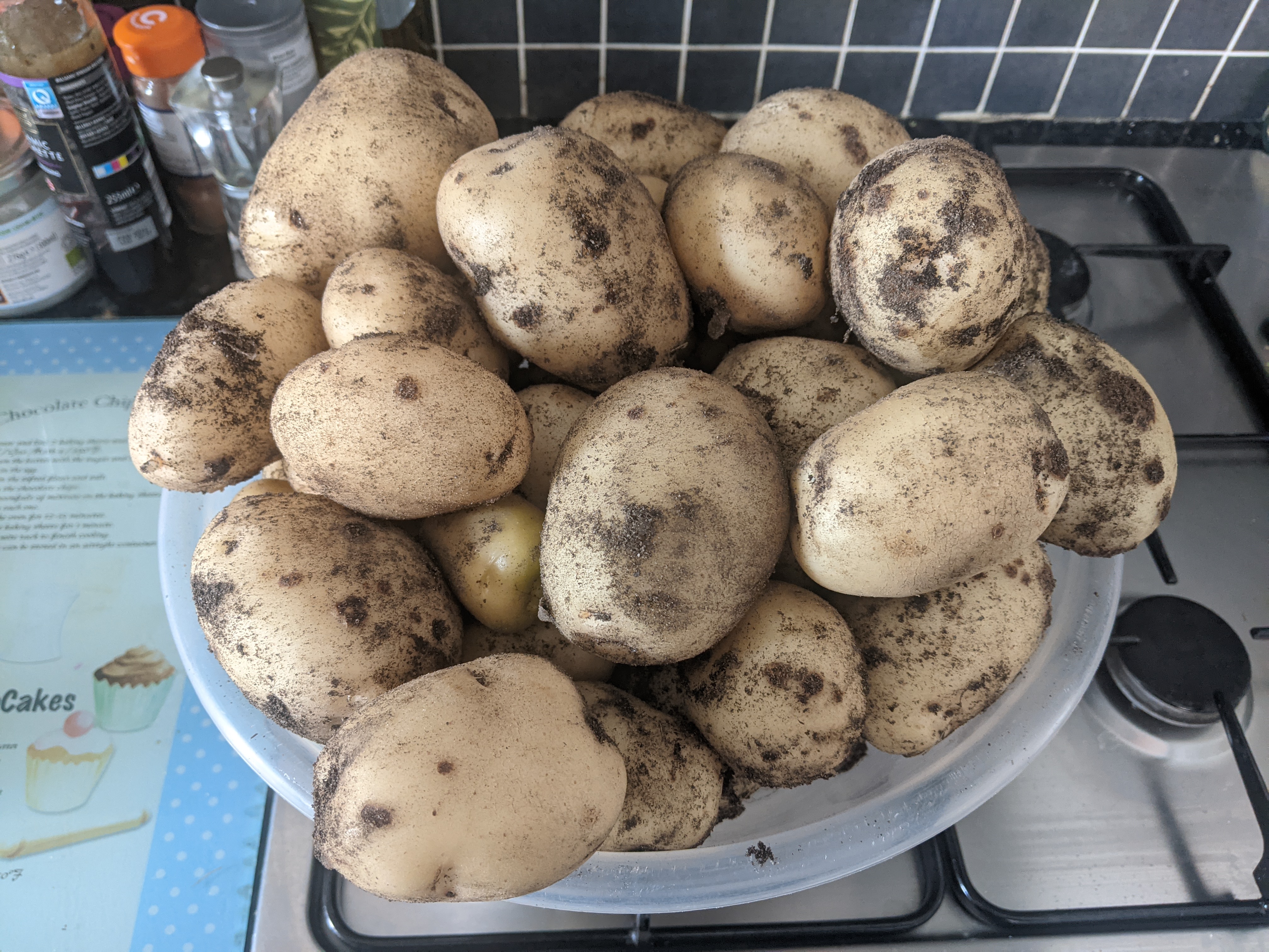 For good measure, we also collected strawberries from one of the raised beds that Geoff has kindly lent us. Giving my husband strict instructions not to eat any before we got home, I got busy pulling five first earlies. They came up easily and beautifully. I couldn’t believe how big the tubers were! It has been a good few years since we had a good potato crop with excessively wet or dry summers. The last time we were hopeful if a good crop, we had an attack of blight which ruined them all.