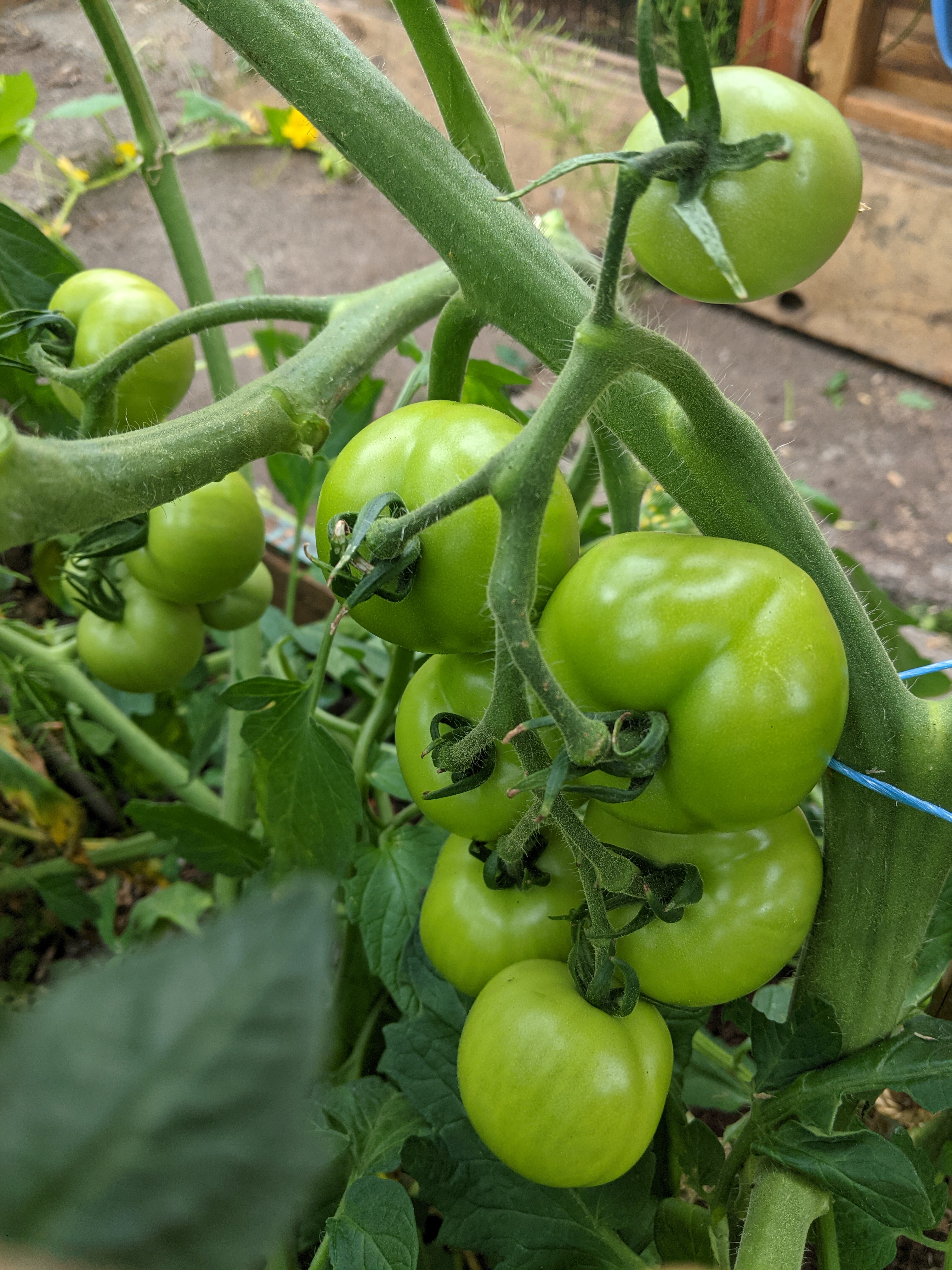 With all the chickens fed and some time spent checking on Snap who seems a little wobbly at the moment, I moved onto the greenhouse. Apart from the occasional watering, I haven’t done much in the greenhouse over the past few weeks and the tomatoes have been busy taking over. I confess to being rather tempted to grab a machete and hack my way through it. Instead, I slowly worked my way through, removing superfluous stems and leaves to allow the light to get to the fruit. Without light, the tomatoes won’t ripen and you risk the fruit being inedible. By the time I had cleared the excess foliage away, my hands were bright green. It took some scrubbing to get it off!