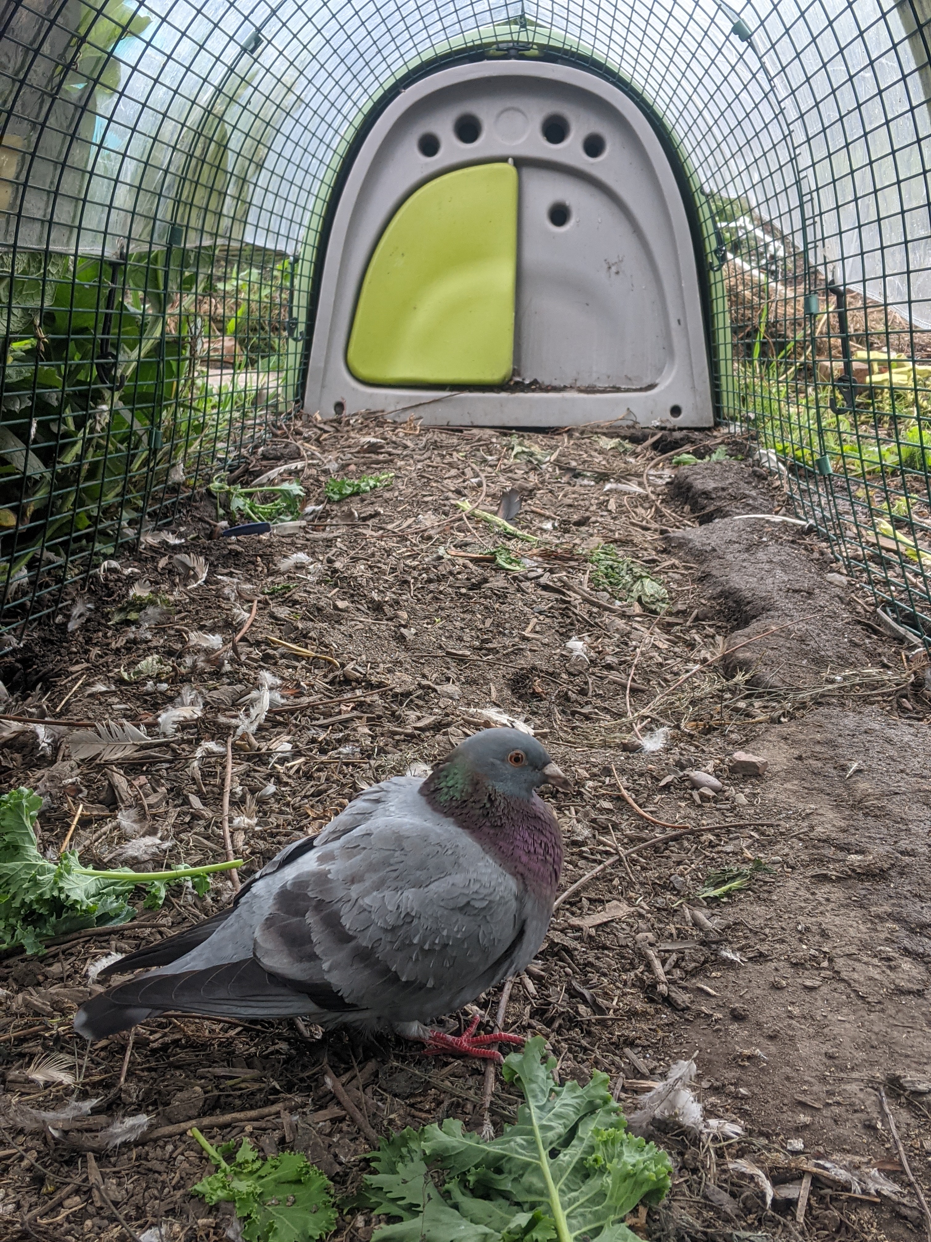 Pausing for a drink in the shed, I pondered whether I could dig over the ground where the Omlet coop had been before the looming black clouds came over. Challenge accepted! As I pulled up the pegs that keep the fox proof skirt in place, I noticed that the run had an unexpected visitor in it. It was a young pigeon. No tags on the legs so clearly not a racing pigeon but nonetheless, it shouldn’t be in the run. Trixy appeared and shouted at it but the belligerent bird refused to move. In fact, it only moved when I began wrestling the run to the other side of the plot. Pausing to check on the feathery trio, I found them all sunbathing on the patio in front of the shed.