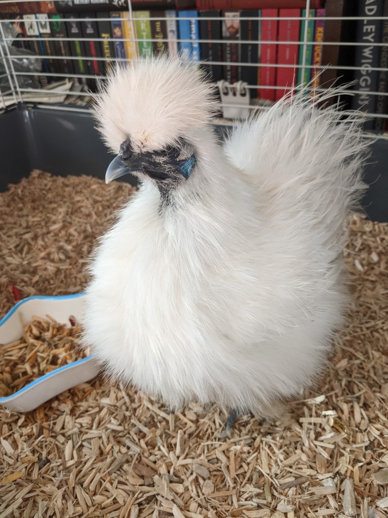 At lunchtime I went out into the garden to check on the chickens. As usual, I had to turf Stratus and Cirrus out of the nest box. As I tried to move Cirrus, I realised how dirty she was. Her previously snow white feathers were approaching a mid-grey with brown muddy flecks. On impulse, I brought her into the house and using a spare bucket partially filled with warm water, I gave her a quick bath. She was really rather patient with the whole process, only occasionally shouting in annoyance when I tried to gently wash out some of the dirt. Wrapping her in a towel, I gently tried to get the worst of the wet off. By the time she began to wriggle, I thought it would be better to put her in the inside cage for a bit to finish drying off. I don’t think Cirrus was impressed with being put in the cage but got busy drying herself off.