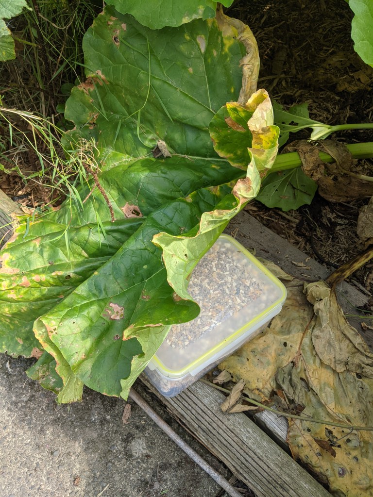 As everyone headed off to their own plots, I herded the Weed Destroyers back into their run and began to pack up. Two weeks ago, I had brought a large Tupperware box down to the allotment to refill it with corn for the chickens at home. When I got home that afternoon, I realised I had forgotten it. Ever since, I have been searching high and low for this blasted box, knowing it had to be somewhere! It wasn’t at home, in the shed or greenhouse. I hadn’t left it in the chicken food bins or in any of the coops. I had pretty much given up hope of ever finding it. Realising how badly the rhubarb was blocking the path, I began to pull some of the worst offenders out. To my utter surprise, hidden underneath one of the large rhubarb leaves was my Tupperware box! I must have put it down and in the couple of weeks I had lost it and the rhubarb had grown over it.
