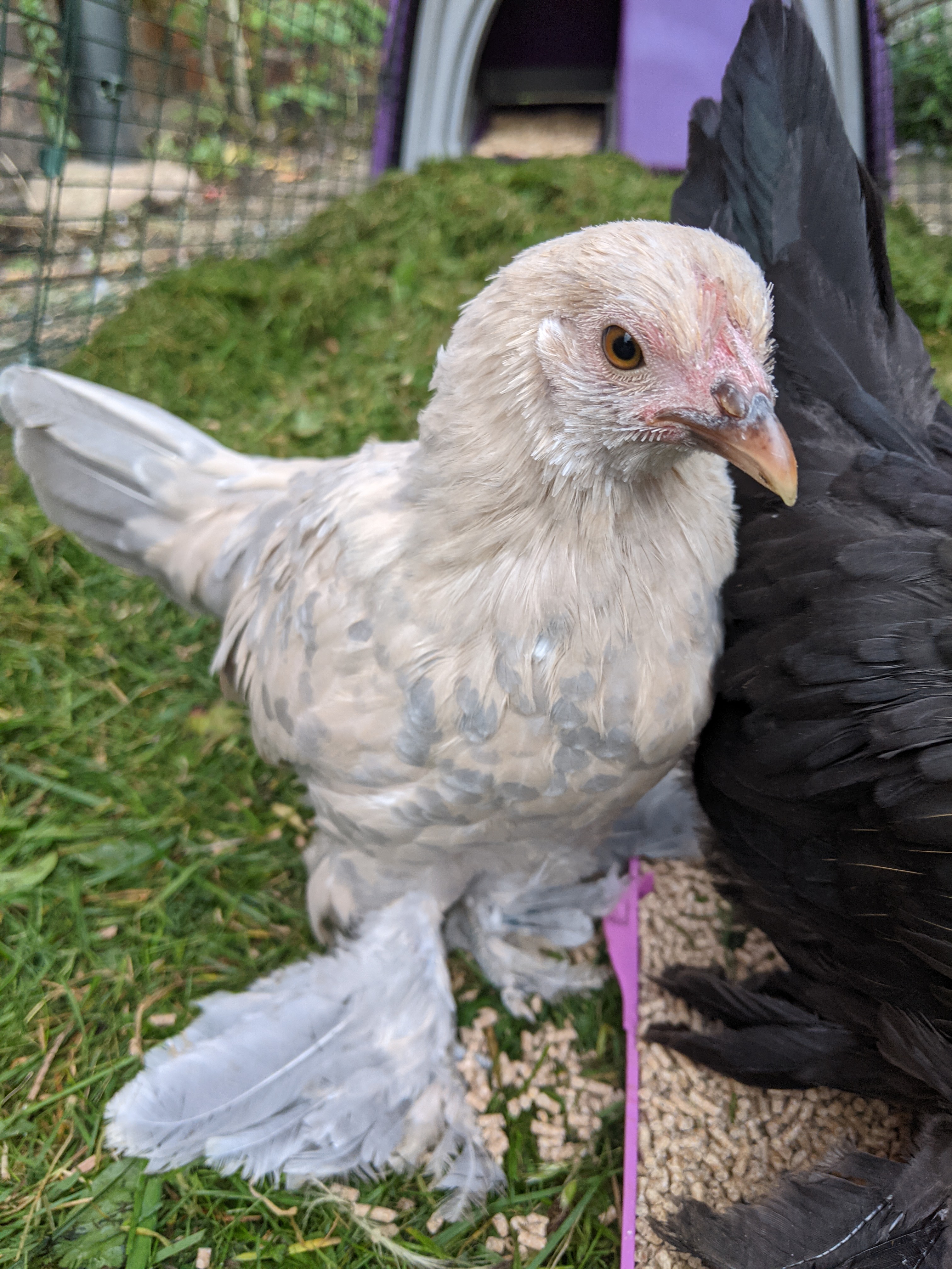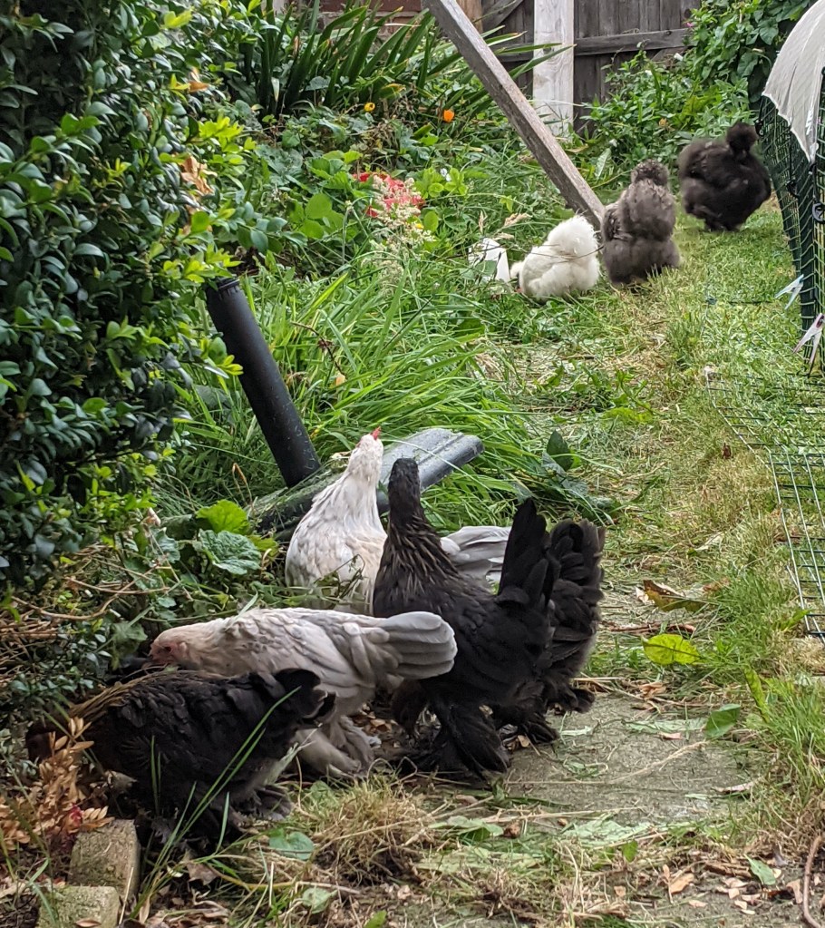 Now stuck at home, I pottered outside to check on the home chickens. I was greeted by five curious feathery faces in the broody coop and on impulse, I let them out to explore. My husband got ready to mow the lawn in preparation for moving the red Omlet with the silkies. Our pottered the silkies who eyed the new chicks suspiciously from a safe distance. Neither set of chickens seemed particularly interested or curious about the other which I found interesting. Previous experience with chickens have seen rival groups fight or at the very least, swear loudly at each other from opposing corners of the coop.