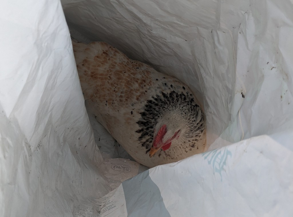 Emboldened by Rey’s attitude, Alba took it into her fluffy head to cause trouble. For reasons known only to her, she decided to climb into an empty food bag and hide in there. My husband moved the bag and nearly dropped it in surprise when he saw Alba’s disgruntled face peering at him from inside the bag. Calling me over, we both stared at her in disbelief. On what planet does it seem like a good idea to climb into a large plastic bag if you are a chicken?! She’s clearly got a few screws loose! Gently, my husband tipped the bag to try and encourage her to come out. She dug in and refused to cooperate. Eventually, my husband had to resort to shaking the bag slightly to get her to move.