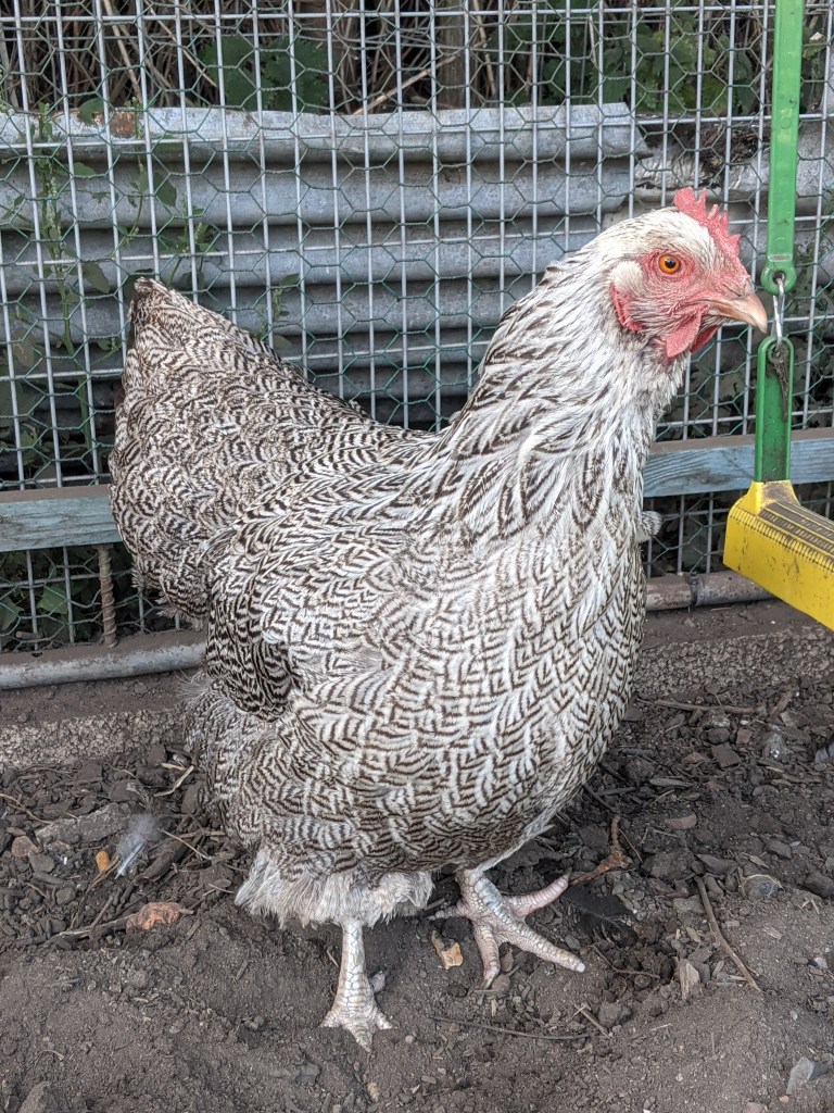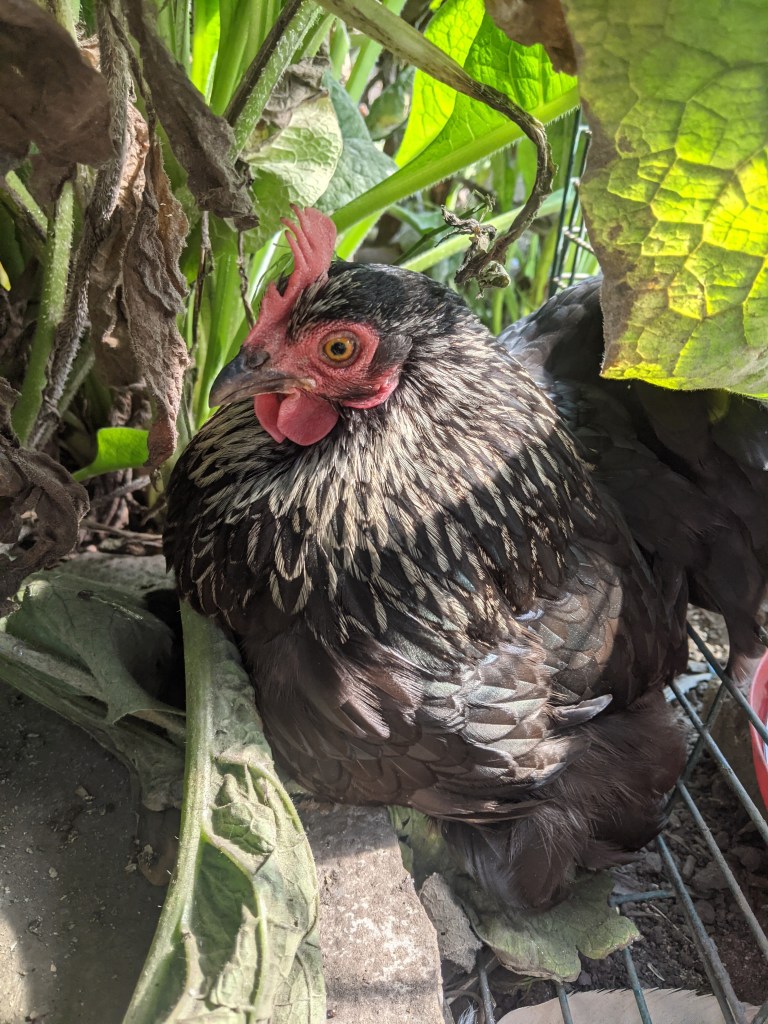 It was hard to garner any enthusiasm to carry on working after lunch, especially as it was cool in the shade. But the chickens needed their nest boxes back and the new coop needed digging over. My husband worked hard digging over the soil in the new coop, I threw in new bedding in the nest house, mixed as always with diatomaceous earth. The addition of diatomaceous earth helps the chickens keep themselves free of the dreaded red mite. By the time my husband had finished digging the second coop, I had put the remaining fresh bedding into the nest box and collected a protest egg from the ground outside the nest box. Some people think that chickens don’t have big personalities, but they should meet Leia. Stubborn and royally spoilt, this hen rules her coop with an iron beak and claw.