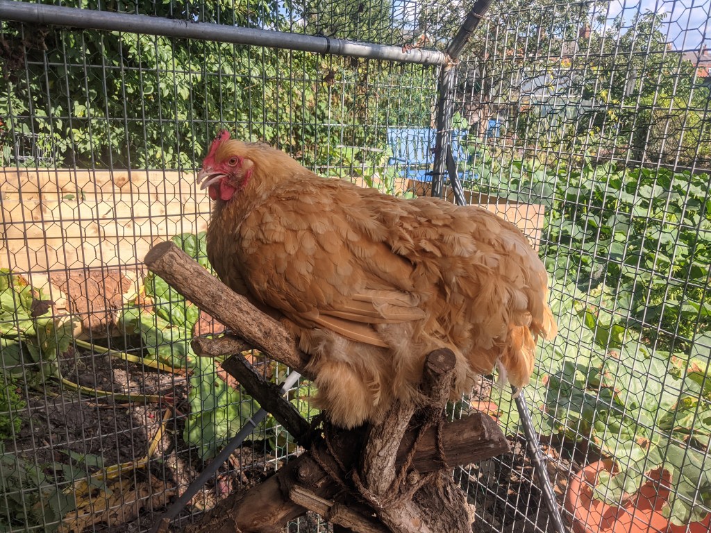 Steve appeared and stopped by our greenhouse to check on the Buff Orpington. She’s definitely perked up over the past couple of days. Steve said we could move her into one of our coops temporarily as she clearly can’t go back in with the brown leghorn cockerel. With the weather being so warm, I decided to take her out and put her into the new coop with Lilja, Leia and Sadie. The theory goes, that without a cockerel, the Buff Orpington should be able to hold her own. The first few minutes seemed to go well but the ment I began to relax, Lilja went into attack mode. I chased her off and put the Orpington up on the perches so she was out of beak range.