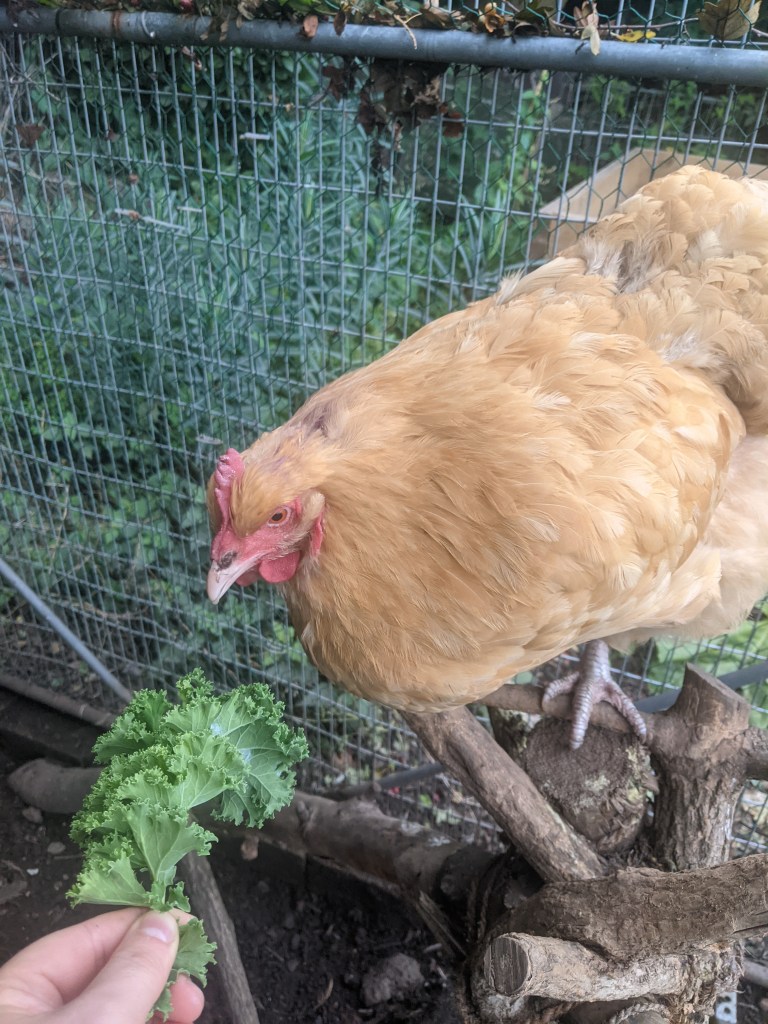 In the Omlet, the Weed Destroyers were cuddled together next to the run door. Picking some kale leaves and shoving them through the wire caused huge excitement with Roxy shoving the other two out of the way to ensure she got to the greens first. Over in the new coop, the Buff Orpington is still preferring to keep out of Leia’s sharp beak by roosting on the perch. She is very timid but I was delighted that she chose to eat some kale from my hand today. To say Lilja and Leia’s beaks were put of out joint by this blatant favouritism was an understatement. But I thought the Orpington deserved it after coping with the others for so long!