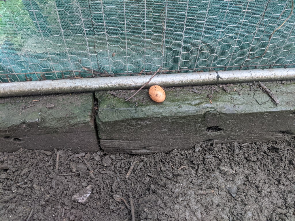 In the main coop, we discovered two eggs laid in ridiculous places. I honestly have no idea which chicken refuses to use the nest box like a normal hen. The first one was tucked away at the back of the coop underneath the perches. But the second had to be seen to be believed! It has been laid on the tiny ledge at the base of the run. How a hen managed to balance there as she laid her egg is entirely beyond me!
