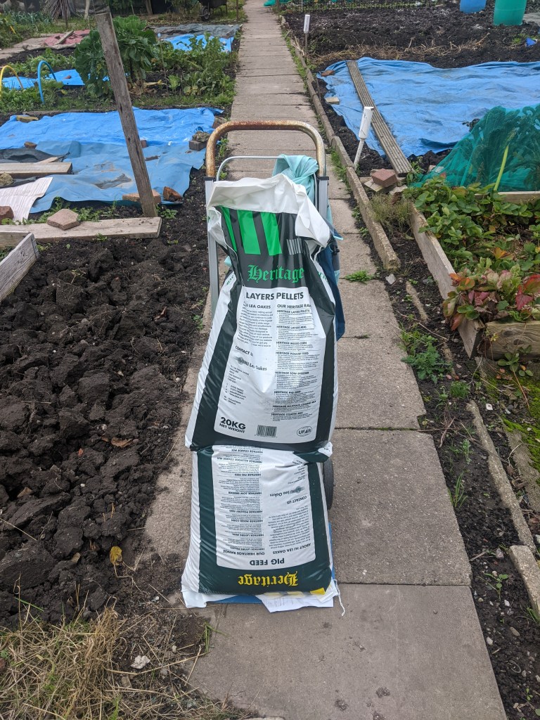 Autumn is my favourite season. The changing of the leaves, the hint of frost in the air and the nights closing in, all mean it’s acceptable to curl up with a hot drink and a warm blanket. Down the allotment however, I find autumn a rather depressing time. The myriad of green foliage slowly gives way to brown soil, the houses hidden for months by plants, come into view. People start to come down less often, leaving only those of us with chickens to battle with the worsening elements each day. With my husband at work, I dragged the bags of chicken food down to the allotment using a small trolley. It worked but it clearly wasn’t designed for moving food bags as inevitably, one of the bags ripped, sending corn all over the floor. This necessitated removing both bags from the trolley,. inverting the offending corn bag and depositing the layers pellet bag on top.