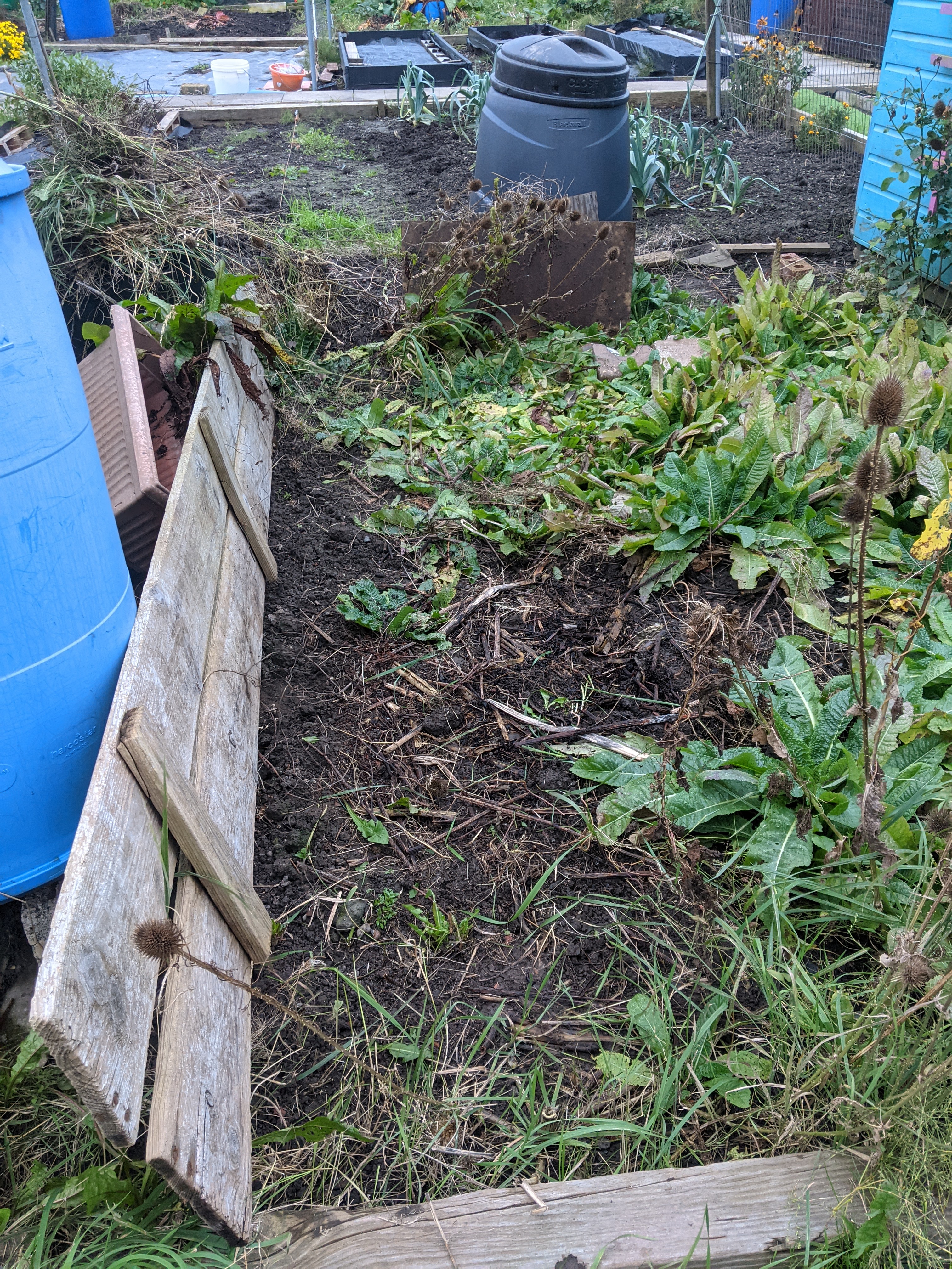 The lady on Plot 35 has given up the bottom half and I had agreed with the new Warden that I would try to clear the worst of the weeds and have it reasonably respectable for a new tenant in the spring. After several difficult weeks at work, it was rather cathartic to rip out swathes of weeds and grass, creating large mounds in the middle of the plot. Tomorrow I will go back with a builder’s bag and pile it in. Removing the weeds overgrowing the path was rather more difficult and I soon gave up. This was a job that needed tools rather than tired hands. Something else to do tomorrow I reasoned.