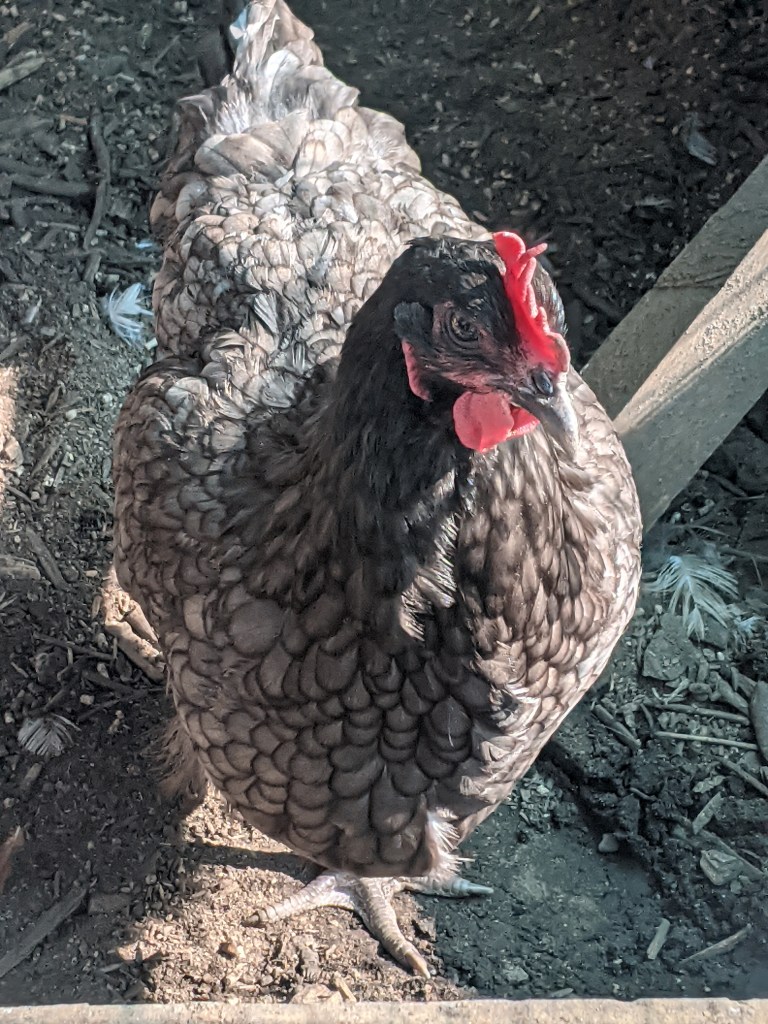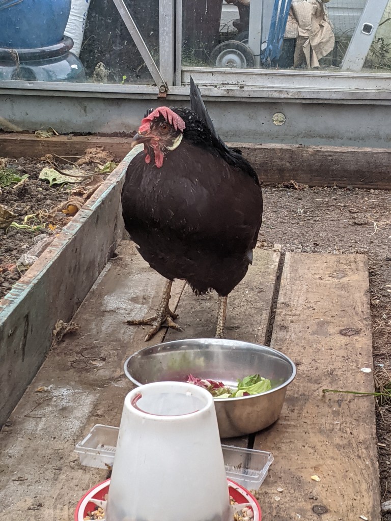 I am at a loss for words. After working all day, I dashed down to the allotment to feed the chickens and check on Cliff’s black leghorn. She seemed happy enough in the greenhouse although her weird crowing was back. I managed to get a few chunks of apple sauce down her but I think she may need another dose of cider vinegar. It’s so difficult when they gape to make sure they are eating and drinking enough!