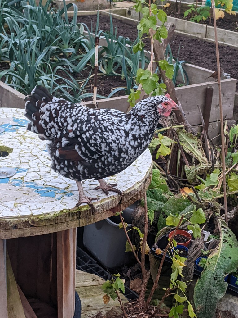 Mid-afternoon, my husband and I ambled down to the allotment armed with coop cleaning supplies and two empty food boxes. Upon our arrival, we chatted briefly to Cliff before we headed off to open up the shed. First job was to sort out cleaning the Omlet. The feathery weed destroyers were left to roam while my husband helped me move the run and nest box. As he got busy digging over the ground, I removed all the old bedding and thoroughly washed the nest box inside and out. Roxy decided she wanted a better vantage point and jumped up onto the table to inspect our work.
