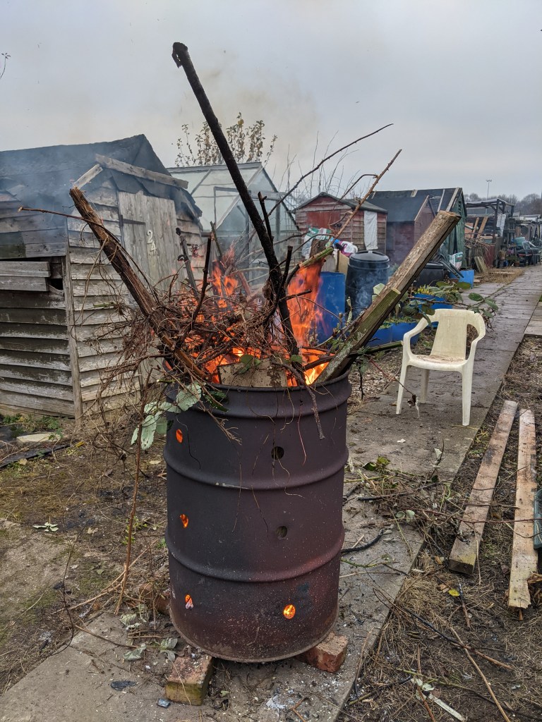 By two o’clock, Cliff and I decided to call it a day and headed down to his shed for a cuppa. We kept an eye on the fire as it burnt down and enjoyed a chat about the beautiful inquisitive robin who came to see what we were up to. As it turns out, Cliff had bought a bag of meal worms for him and the little robin was happily hoovering up any within beak range. Just before I left, I ran around to check on the chickens, all of whom are definitely grumpy about Flockdown. Promising them I would add some boredom busters over the next few days, I headed home covered in dirt and smelling strongly of wood smoke.