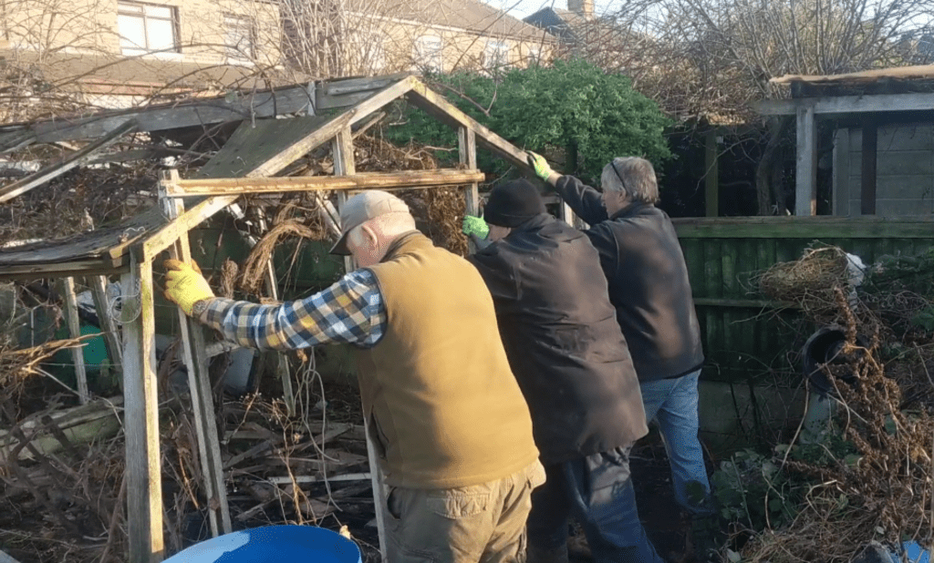 Big changes were set in motion today. I dashed down to the allotment later than planned to find Derek, Cliff and Ian busy working on Plot 22. This plot is in the process of being given up and the ancient wooden greenhouse was barely standing. The wood had rotted to the point where the glass was sliding out of the roof and the old grapevine was the only thing keeping it all upright. By the time I had arrived, all the glass had been taken out and put to one side by the shed. Cliff was busy inside the greenhouse with Ian, passing out pots, watering cans and various other odds and ends. Derek was helping sort the items into two large builder’s bags.