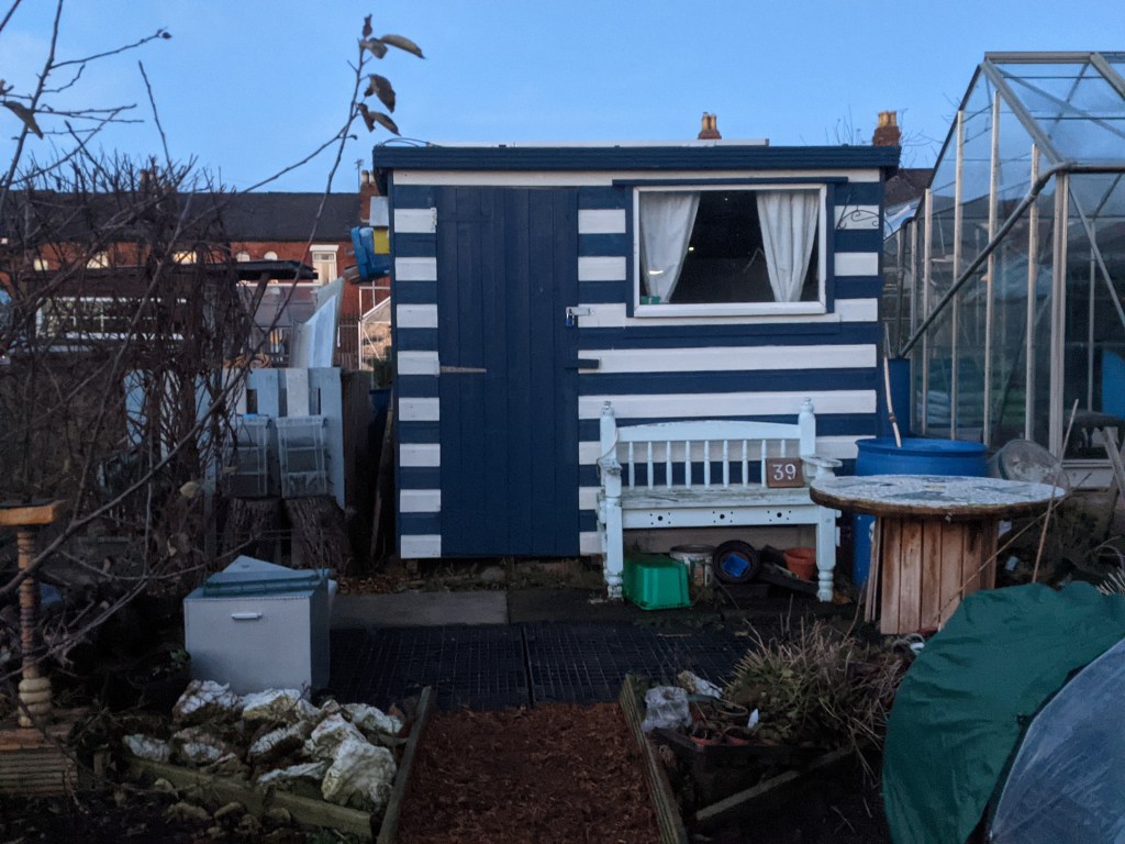 At the moment there just don’t seem to be enough hours in the day to fit everything in. Usual last minute preparations for Christmas today saw me dash down to the allotment at four o’clock, just as it began to get properly dark. Leia and Flora were already half asleep on the top of the nest box in the greenhouse but woke up and greedily hogged the fresh pellets and corn I put out for them.