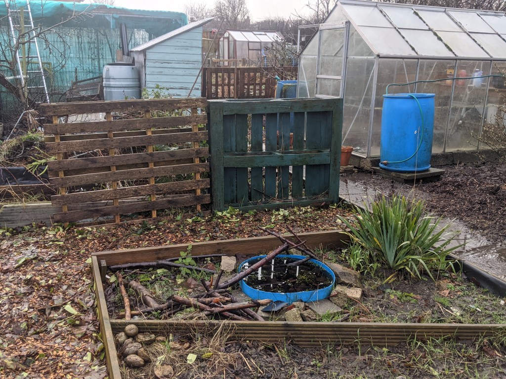 Back outside again and I noticed the clouds had started to get a bit darker. Nevermind, it wasn’t going to rain properly. It was already lunchtime and the forecast has said it would rain heavily all day. Now to clear the back part of the plot behind the fruit section. By the time i got to the fruit section, it had begun to rain. Two seconds later, the heavens had opened and a torrent of rain washed over me. Pausing only to wonder at my own idiocy in thinking that the British weather could be relied on to be dry in January, I sprinted back to the shed, throwing open the door and diving inside. For the next ten minutes, I hid in the shed, waiting for it to stop.
