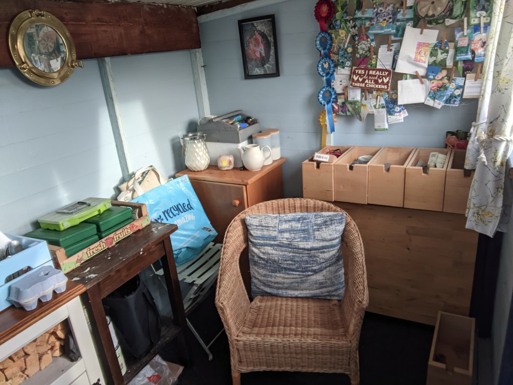 My first job, once I had opened up the shed, was to clear the patio. Being the only non-muddy part of the plot, over the winter, it gets cluttered up. One rubbish bag full and on a roll, I cleared out and tidied the greenhouse. Leia and Flora took great delight in constantly getting in my way, whether it was under my feet or sitting on something that needed moving. All this clearing made the need for sorting out the nest box and greenhouse floor seem more urgent. I removed the food and water bowl and left the girls with strict instructions to eat the remaining food on the floor.