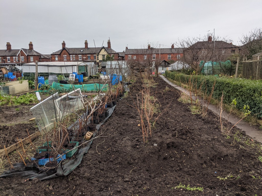 With all that excitement over, I went to see Geoff and Cliff who were busy working on the greenhouse on Plot 8. Apparently, Geoff had accidentally bumped the side of the greenhouse as he passed by on his mobility scooter. The path there is incredibly narrow and there was wild talk of shifting the greenhouse a foot or so backwards so that the path could be the proper width. Under the direction of Cliff, I helped put two bits of glass back in to replace the broken ones. We came rather unstuck when we ran out of clips and the triangular piece at the top tried to throw itself onto the ground. But as ever, Cliff won the day!